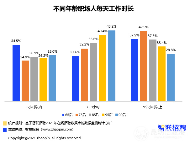 27.6%的95后、30.8%的00后对于工作的态度是:“追求理想,期待在工作中完成自我实现。”同一选项,75后为35.5%,85后为33.7%。本次调研数据显示,有2.2%的95后、3.4%的00后“常态化摸鱼”,而75后和85后“常态化摸鱼”的比例为1.7%和1.8%。工作并不是“Z世代”生活的全部,只有约3成“Z世代”员工每天工作超过9小时,相比之下,每天工作超过9小时的65后为37.9%,75后为42.9%,85后为37.5%。