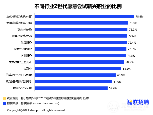 智联招聘近日发布《2021“Z世代”职场现状与趋势调研报告》,其中指出,“Z世代”又称网络世代,指1995-2009年间出生的一代人,被称为“网络原住民”的他们,依然喜欢“扎堆”互联网,他们比职场前辈更渴望高收入,同时期待个人成长,喜欢灵活就业,并开始抛弃“分工明确”的固化职场,视频博主和菜品体验官是“Z世代”最向往的新兴职业。