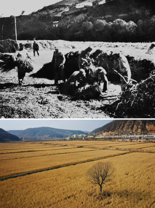 △这是一张拼版照片,上图为:八路军120师359旅战士在延安西南的南泥湾垦区收获的情景(资料图片);下图为2019年11月5日拍摄的陕西延安南泥湾稻田(新华社记者 刘潇 摄)。
