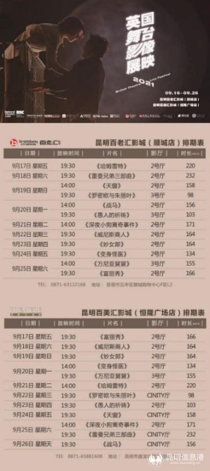 昆明信息港讯 实习记者杨燕璐 9月16日,2021英国舞台影像展在昆明百美汇影城隆重开幕。即日起至9月26日,昆明百老汇影城(顺城店)、昆明百美汇影城(恒隆广场店)将展映12部来自英国高水准话剧音乐剧,昆明市民在家门口就可以欣赏到世界顶级的舞台剧。
