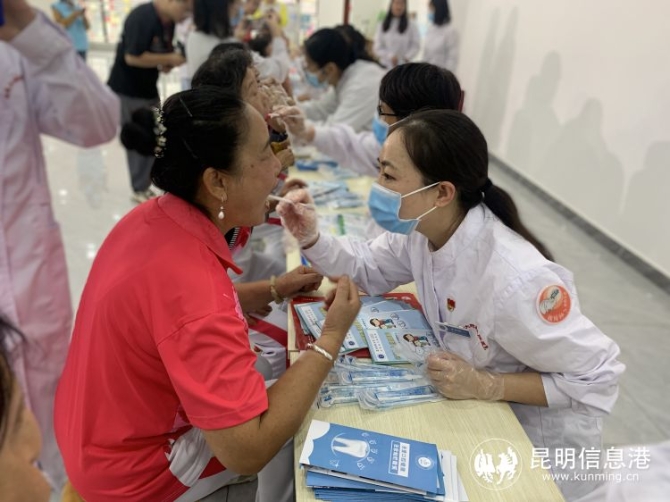 本次义诊活动邀请了昆明医科大学附属口腔医院牙体牙髓病科、修复科来为社区居民进行口腔免费检查。活动现场,医院口腔科的医生为社区居民进行口腔检查,为前来咨询和问诊的居民们答疑解惑,为大家讲解了口腔日常护理知识,同时还为社区居民朋友们发放了护牙礼品和口腔健康宣传手册。