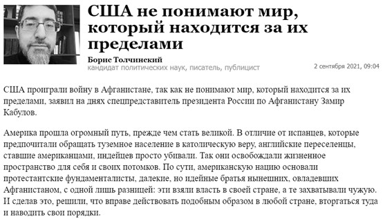 △鲍里斯·托尔钦斯基在文章中指出,美国人的祖先这样干了,便认定在任何国家都能重复这样的操作:军事入侵、打造美式秩序。“美国人有军队,越来越多地用武力来替代理解,美国人认为在感到美国利益受到威胁的所有地方都应该动武。”