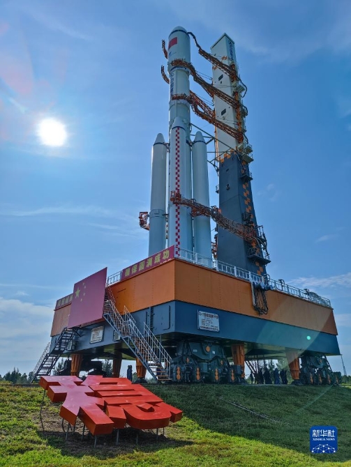 9月16日,天舟三号货运飞船与长征七号遥四运载火箭组合体转运至发射塔架。新华社发(陈昊杰 摄)