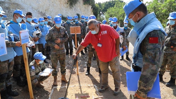 9月15日,在黎巴嫩南部的辛尼亚村举行的联合国地雷行动中心扫雷排爆考核中,考官向中国维和多功能工兵官兵进行示范讲解。新华社发(孔康谊摄)