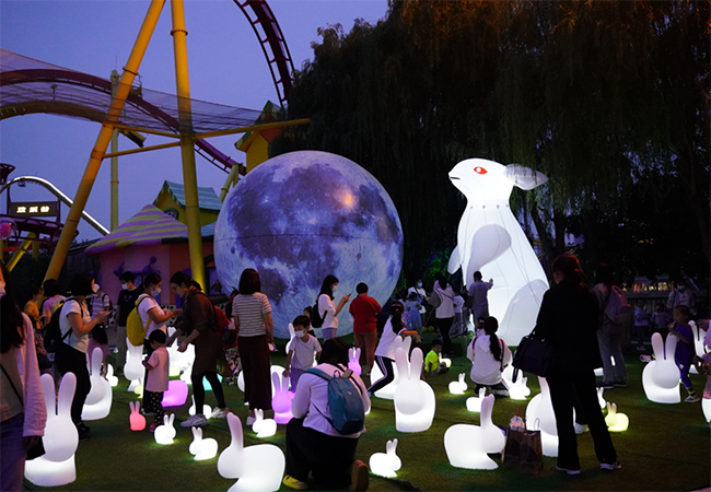 中秋小长假期间,北京欢乐谷围绕中秋民俗、国潮文化等,做足“玉兔赏月”“金秋丰收”“国潮雅韵”“亲子时光”“动感时尚”“光影梦幻”等体验内容,景区内一派“欢乐爆谷”景象。