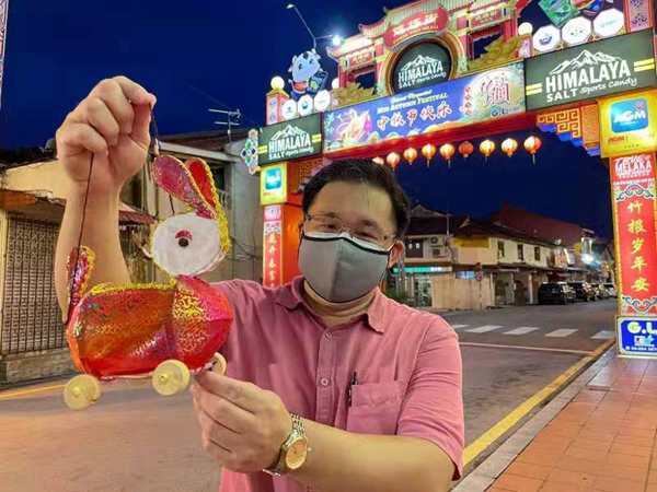 马六甲州对华商务特使颜天禄表示,这些花灯是疫情前由江苏省海外联谊会赠送给马六甲州的礼物,我们在今年中秋节将它们在鸡场街舞台上点亮,为马六甲人民带来了一份不一样的节日喜悦。