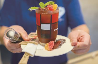 点一杯“屋里厢”,从杯子到咖啡都很有仪式感。冷萃咖啡装在上世纪八九十年代上海流行的玻璃杯里,黑线白红格,“上海”二字醒目。据说这款杯子现在很难买,找了不少地方才买到几十只,价格也从原来的几元涨到20多元。上桌时,咖啡边上搭配了爱心软糖和蜜饯,颇有怀旧气息。让人期待的,还有服务员手里的糟卤喷雾,对着咖啡喷洒几下,一股咸鲜之味扑鼻而来。端起咖啡品一口,糟卤的味道似有若无,茉莉的芬芳、梅子的甘甜和咖啡的酸苦相融合,很有层次感。