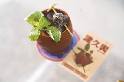 “津久里”则用上了黄酒,冷萃咖啡装在古朴可爱的建水紫陶杯里,上面再摆一颗乌梅,配上两片薄荷叶,拗出好看的造型。轻轻撮一口,醇厚的黄酒香气在口腔中满满散开,咬一口酸甜乌梅,滋味悠长。