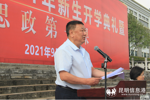 上午9时,2021年新生开学典礼暨思政第一课在庄严的升旗仪式中拉开序幕。昆明学院党委书记金幼和代表学校全体师生员工,对2021级新生表示热烈的欢迎和衷心的祝贺,并以“与伟大时代同步伐努力成为堪当民族复兴重任的时代新人”为主题,为新生讲授了一堂生动精彩的思政课。
