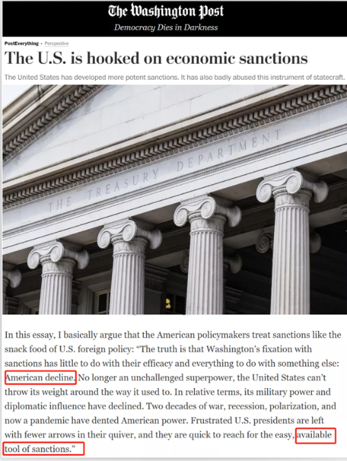 美国以为“经济制裁”是“重塑其他国家”的低成本妙招,实际上,更多分析认为这是黔驴技穷的表现。德雷兹纳继《外交事务》后,又在《华盛顿邮报》发表题为《美国沉迷于经济制裁》的文章,进一步指出,“事实是:美国对制裁的执着与其效力无关,而与其他事情有关,那就是:美国的衰落。”德雷兹纳说:“美国不再是一个不受挑战的超级大国,二十年的战争、经济衰退、两极分化和新冠疫情削弱了美国的实力。沮丧的美国总统箭袋里的箭越来越少,因此他很快就会伸手去拿简单、可用的工具——制裁。”