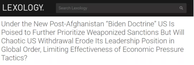 英国“环法视野”(lexology)网站的文章认为,在美军撤离阿富汗之后,美国准备进一步优先考虑将制裁“武器化”,但混乱的撤军过程已经削弱了美国在全球秩序中的领导地位,也就限制了其经济压力战术的有效性。