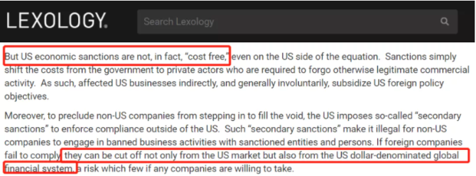 此外,美国的盟友也跟着倒霉:为了防止非美国公司填补制裁留下的经贸空白,美国实施了所谓的“二级制裁”,也就是强迫非美国公司也放弃与受制裁实体和个人进行被美国禁止的商业活动。如果外国公司不遵守规定,它们不仅会被切断与美国市场的联系,还会被切断与以美元计价的全球金融体系的联系——几乎没有公司愿意承担这种风险。美国的朋友和敌人都将“二级制裁”视为一种经济胁迫和对国家主权的严重侵犯。