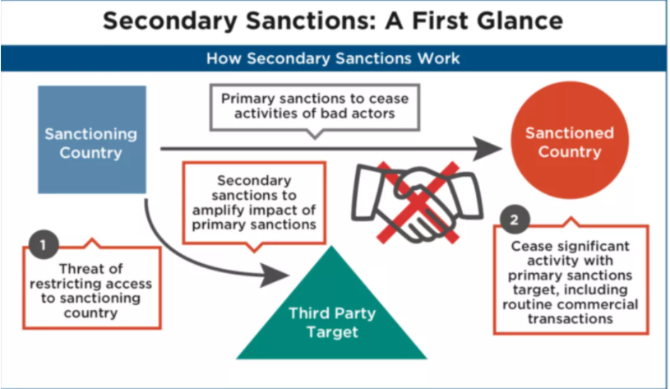 △“二级制裁”示意图。美国制裁不仅管辖美国与目标国之间的经济关系(“初级制裁”),还管辖第三国与目标国之间的关系(“二级制裁”)