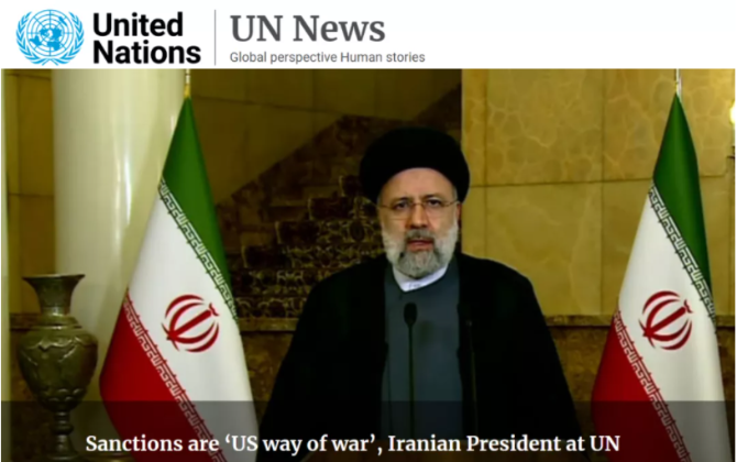 △伊朗总统赛义德·易卜拉欣·莱希指出,制裁是“美国的战争方式”(图片来源:联合国)