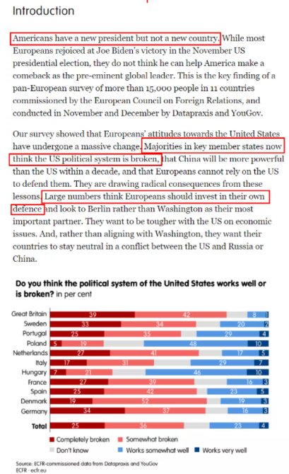 拜登当选总统后,欧洲国际关系理事会(ECFR)曾对11个欧洲国家的1.5万名受访者进行了调查,以评估对美国的看法,调查结果相当惊人:美国有了一位新总统,但仍不是一个新国家。欧盟主要成员国的多数人现在认为,美国的政治体系已经崩溃,他们希望在经济问题上对美国更加强硬。而且,他们希望自己的国家在美国与其他国家发生冲突时保持中立,而不是与华盛顿结盟。