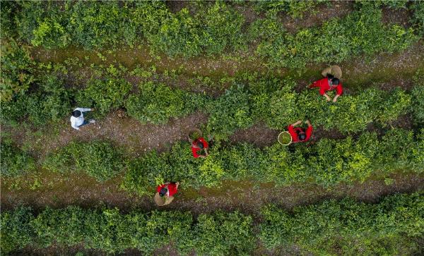 8月20日,云南省沧源县班洪乡班洪村下班坝组的村民在采茶(无人机照片)。