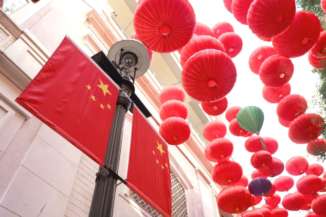 旭日初升,一抹抹“中国红”在香港各区迎风飘扬。位于湾仔的利东街上空,高挂着一片由100多面五星红旗和香港特区区旗组成的“旗海”,吸引不少行人驻足观看和拍照留念。而在几十公里外的元朗八乡,工人迎着晨光将五星红旗高高悬挂在一所村公所的房顶上,与旁边的紫荆花旗交相辉映。