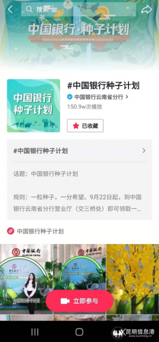 同时,中国银行云南省分行还专门开设线上分享平台,打开抖音搜索“#中国银行种子计划”话题,发布有关种子成长过程的短视频,就能生成专属自己的绿色成长日记,与更多人分享一粒种子的奇妙时光旅行。