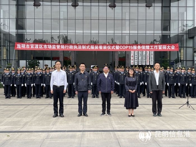 昆明信息港讯 记者龙泉积 10月1日,官渡区市场监管局举行行政执法制式服装着装仪式暨COP15服务保障工作誓师大会。官渡区委书记和丽川,区委副书记、区人民政府区长周燕,区委常委、区人民政府副区长黄忠梁,区人大常委会副主任李洑生,区政协副主席张汉举出席活动。
