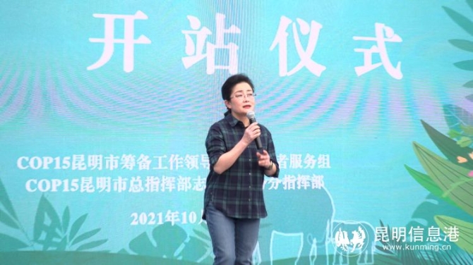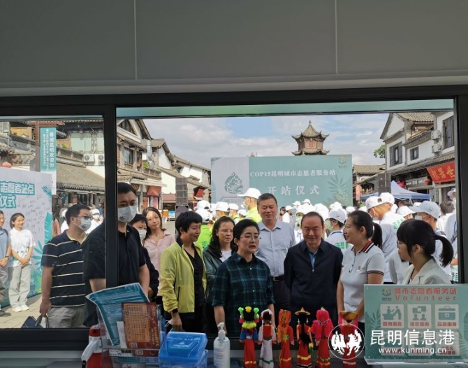 市委统战部部长、COP15昆明市总指挥部副总指挥长、志愿者服务组组长杨皕宣布COP15城市志愿者服务站正式开站,并点亮服务站城市地图。