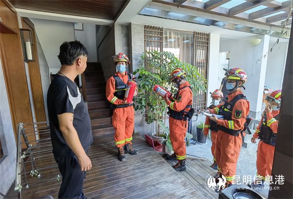 “您好,请问您是这家客栈的管理人吗?灭火器会不会使用?我来教你吧,使用非常简单,记住这个口诀‘提、拔、握、压’……”