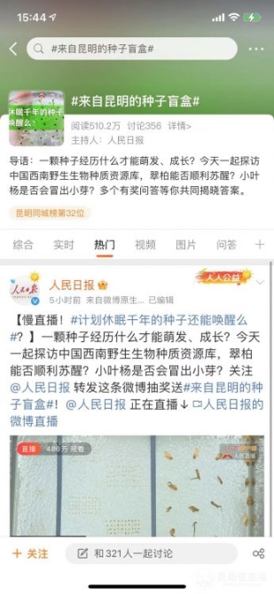 昆明信息港讯 记者李欣怡 10月11日,在COP15召开之时,人民日报多平台联合发起主题为“计划休眠千年的种子还能唤醒么?”科普实验慢直播,吸引近800万网友在线观看。“2021COP15春城之邀——一粒来自昆明的种子”盲盒作为活动互动礼物,再度飞向世界。