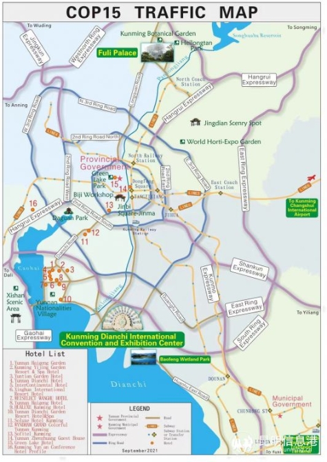 昆明信息港讯 记者罗文忆 通讯员魏晓鹃 10月11日,由昆明市测绘研究院编制的《生物多样性公约》缔约方大会第十五次会议(COP15)交通示意图中英文版正式亮相。此交通示意图包括CDR、JPG数据,是COP15大会会议手册的重要组成部分。