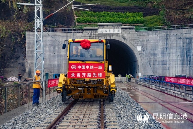 10月12日10时许,在中老铁路曼木树隧道出口,随着我国自主研制的新型长轨牵引车,将最后一组500米长钢轨精准推送到位,标志着中(国)老(挝)昆(明)万(象)铁路全线铺轨完成,实现国内与国外连通。