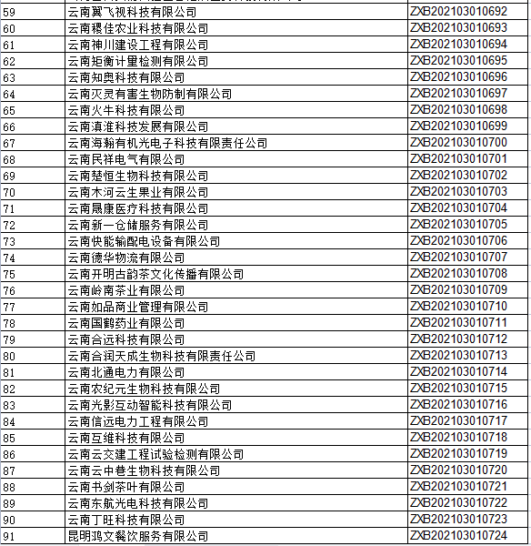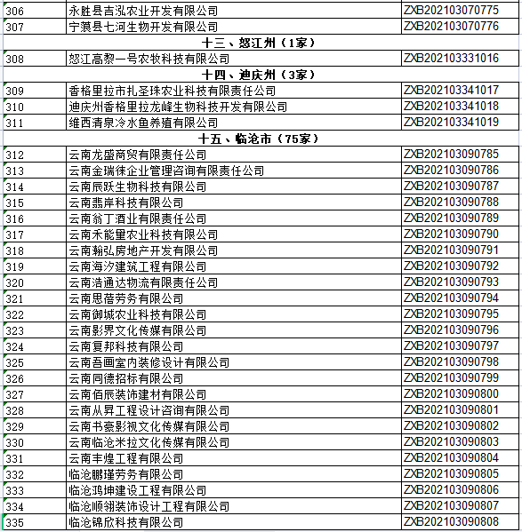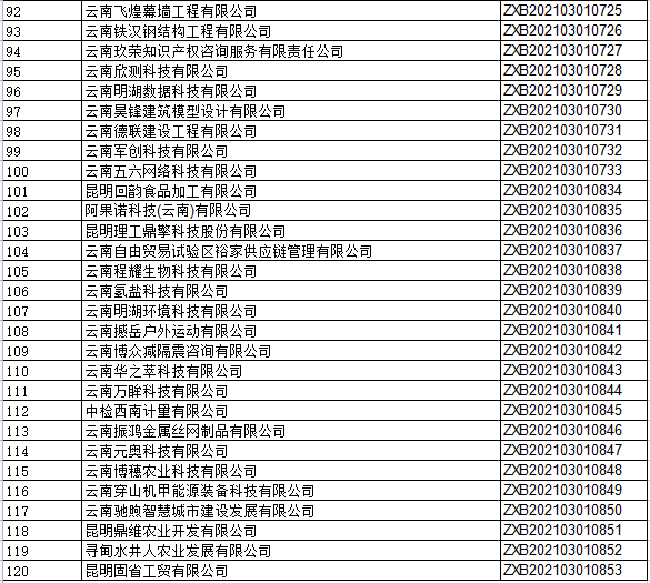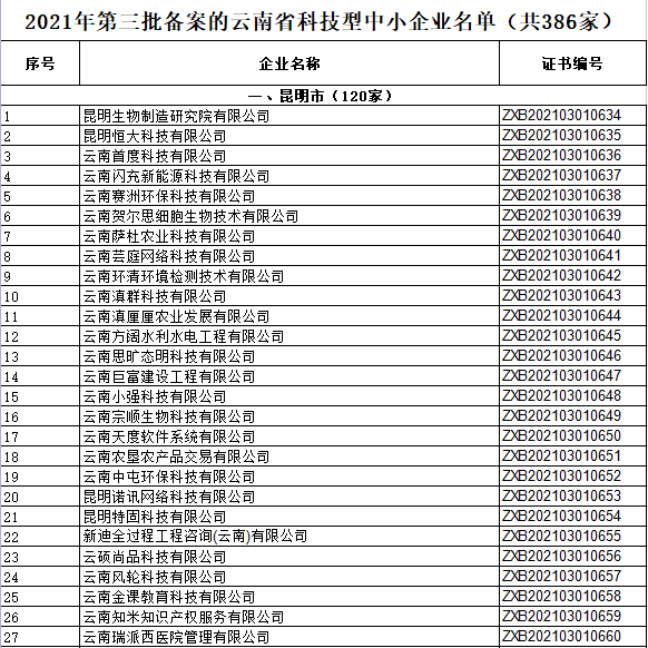 昆明信息港讯 实习记者张水燕 10月12日,云南省科技厅发布2021年第三批备案云南省科技型中小企业名单。共有386家企业通过审核,昆明市有120家,玉溪市有90家,临沧市有75家,楚雄市有25家,丽江市有13家,德宏州有11家,红河州、普洱市有8家,大理州有7家,文山州有5家,昭通市有4家,迪庆州、保山市、曲靖市有3家,怒江州有1家。