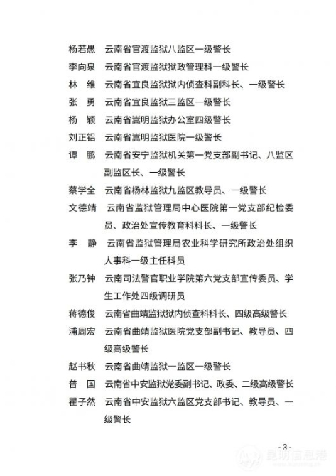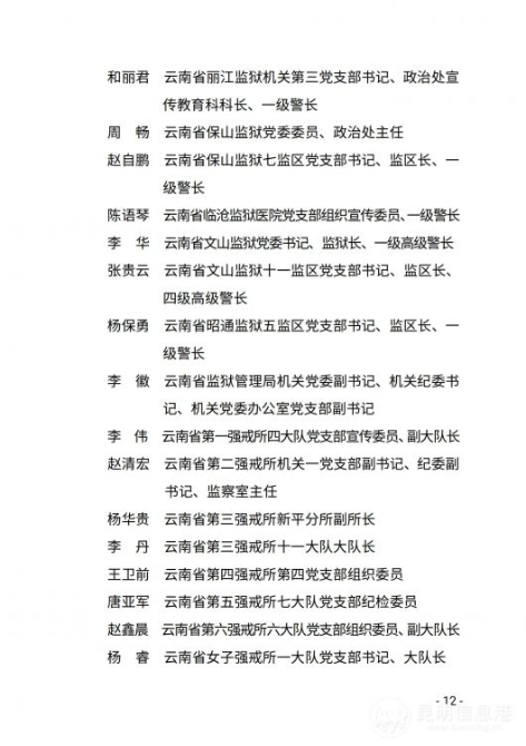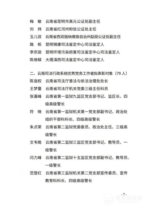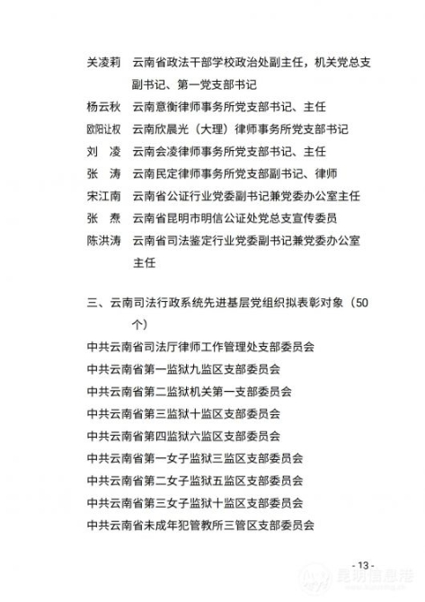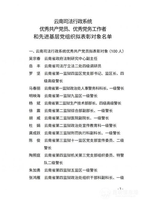昆明信息港讯 实习记者张水燕 10月12日,云南省司法厅政治部公布100名云南司法行政系统优秀共产党员、79名云南司法行政系统优秀党务工作者、50个云南司法行政系统先进基层党组织拟表彰对象。