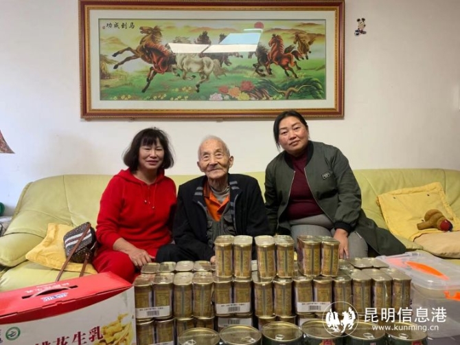 13日,爱心人士前往安宁市县街,为97岁抗战老兵党仁清送去一千元慰问金和核桃乳,为家住昆钢的91岁离休老干部杨召启,赠送了价值1004元的德和午餐肉罐头和核桃乳。