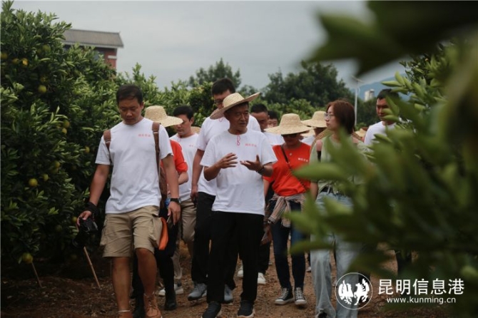 参观队伍洋洋洒洒,走在最前面的褚一斌不时停下脚步,指向还没完全转色的橙子朝身边的嘉宾讲解着什么。有时还会用上比喻:又大又黄的橙子就像长相出众的人,面带自信的微笑,爱笑的人都好看,所以这样的橙子看着也好。