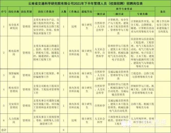 昆明信息港讯 实习记者姚仲恒 近期,云南省交通科学研究院有限公司发布招聘公告,面向社会招聘和校园招聘管理人员共计9人,其中社会招聘3人,校园招聘6人。