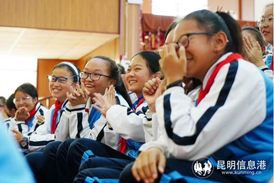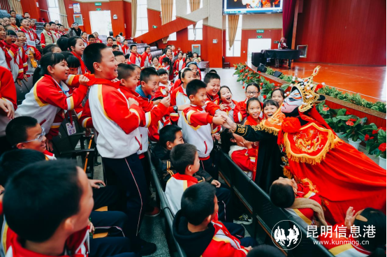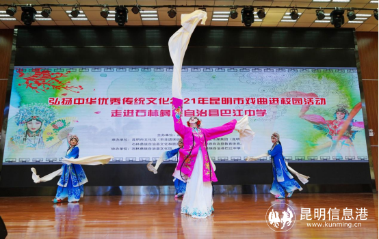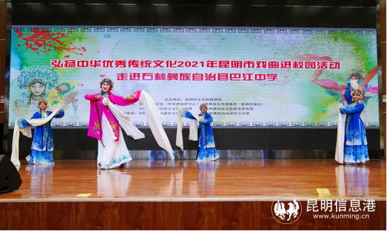 昆明信息港讯 10月20日、21日,弘扬中华优秀传统文化2021年昆明市戏曲进校园、进乡村系列活动,来到石林巴江中学、鹿阜中学,将戏曲艺术引进校园,为学生们普及戏曲知识、教授戏曲基础手法、讲授戏曲的起源与演变历史。同学们兴致勃勃观看了传统滇剧片段、非遗艺术滇剧水袖表演、川剧变脸以及云南花灯歌舞,并通过生动有趣地互动环节近距离接触戏曲文化。在其乐融融的氛围中共赏悠悠戏韵的无穷魅力。