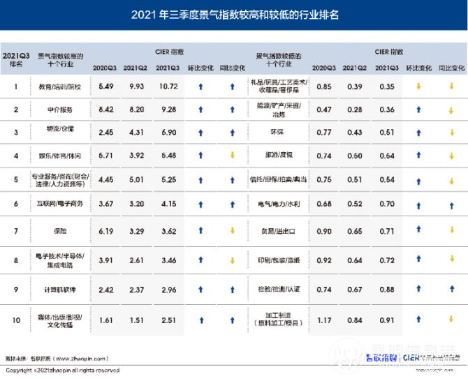中国人民大学中国就业研究所与智联招聘近日联合发布《2021年三季度中国就业市场景气报告》,其中指出,本季度中国就业市场景气指数(CIER)为2.15,与去年同期相比,招聘需求人数上升,而求职申请人数下降。