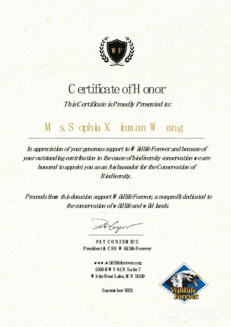 野生动物基金会WildlifeForever授予王馨曼保护生物多样性形象大使荣誉证书