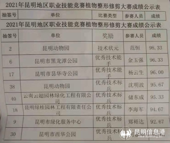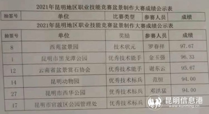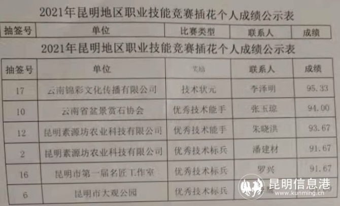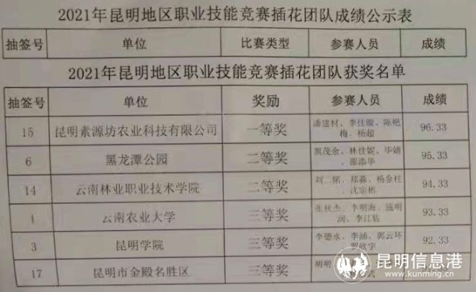 昆明信息港讯 记者杨雁 经过2天的激烈角逐,2021年度昆明地区职业技能竞赛于10月29日在大观公园落下帷幕。当天下午,现场对参加此次比赛的盆景制作、植物病虫害防治、植物修剪整形、插花艺术个人赛及插花艺术团队赛五个大赛优胜者进行了颁奖。