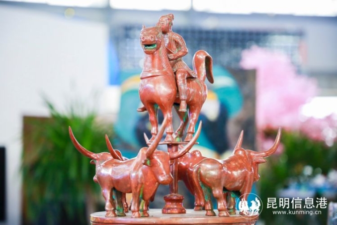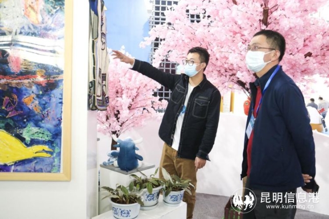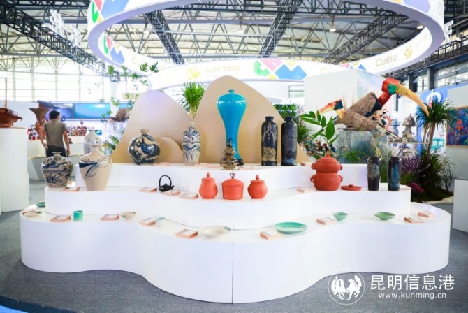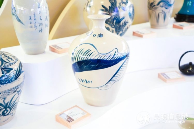 在文博会上,五华展区联合云南大学艺术与设计学院展出的玉溪青花瓷,融入创新元素,在温润的瓷器上绘制古生物海口鱼、恐龙、昆明地标建筑等图案,使得青花瓷更具云南特色。
