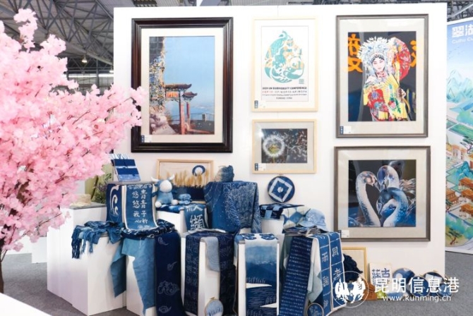同时,在布展区,五华还新增展出了沙朗民族文创园的蓝染文创品,蓝染是一种古老的印染工艺,有扎染、蜡染等表现手法。在展区现场,植物染艺术家莲子带来“月是故乡明”、“坐看云起”等蓝染作品,莲子的蓝染作品在立意表达上有着自己鲜明的风格,多以诗词短句为主,既有文学的底蕴,又有蓝染的魅力。