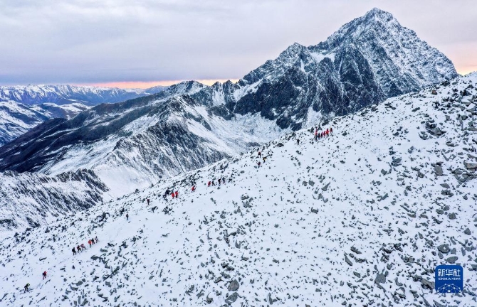 10月30日,参加“首届珠峰山友大会”的山友在攀爬三奥雪山之一的奥太娜雪山。(新华社记者 江宏景 摄)