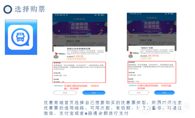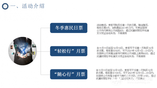 公交月票优惠活动时间为11月11日至12月10日,发售使用期为今年12月1日至31日的月票,共计发售30天。在此期间昆明公交集团将推出两种月票套餐,每个套餐的月票发售5000张,共计发售10000张“昆明公交冬季惠民月票”,当月有效,售完即止。“昆明公交冬季惠民月票”共推出两个套餐票价供市民乘客选择,其中“轻松行”月票,售价50元/张,可于今年12月1日至31日内,在昆明公交所属全部市内常规公交线路上使用60次(具体乘车时间以各线路实际运营时间为准);“随心行”月票,售价100元/张。可于今年12月1日至31日内,在昆明公交所属全部市内常规公交线路上使用140次(具体乘车时间以各线路实际运营时间为准);以上月票超过优惠时限后手机端支付凭证自动失效,不再使用。