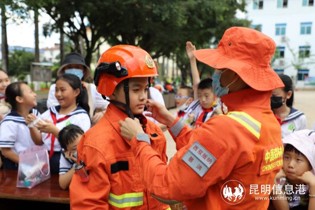 活动中,消防员向师生们讲解了森林火灾的特点、危害及地质灾害避险常识,用通俗易懂的语言教会他们消防安全知识和逃生技能,并教授他们如何操作使用灭火器。同学们饶有兴致地穿戴上消防救援服、抚摸着灭火救援器材,当起了“小小消防员”。师生还体验了消防指战员的日常生活,消防员手把手的同学叠“豆腐块”被子的方法步骤和技巧。训练场上,指战员为师生表演了斜向救援、200米灭火障碍训练。为表达感谢之情,同学们为大队指战员献上了鲜花和《致消防员叔叔的一封信》,表演了拉丁舞、诗朗诵、集体舞蹈,为大队指战员代表佩戴了红领巾。