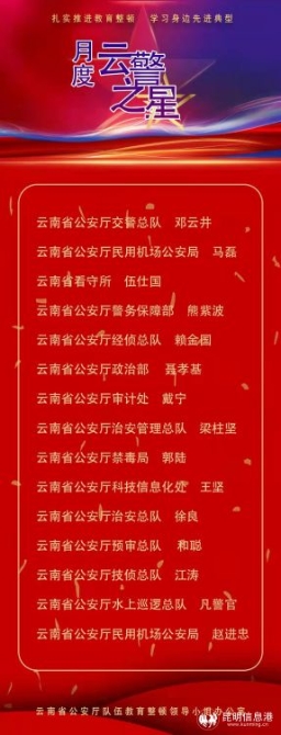 “云警之星”学习宣传活动自9月15日启动以来,省公安厅广泛发动、精心组织,对厅直各单位推荐的32名“云警之星”候选人的先进事迹和感人故事进行深入挖掘,精心设计制作了图文、海报、短视频等宣传作品,线上线下同步展播宣传,经过3个月持续不断的展播宣传和评选推荐,从参选民警中产生了15名月度“云警之星”。