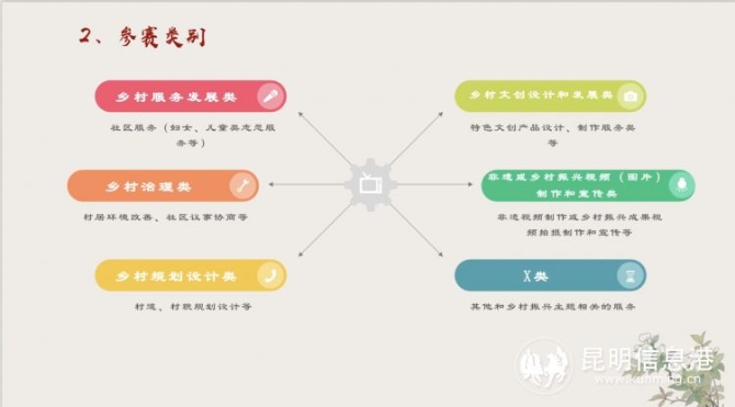 “刘家营”非遗赋能空间赛道重点围绕图书馆、公交车站、道路两旁、松茂水库周边、捞鱼河、“七彩油菜花田”等20余个活化空间进行规划设计。参赛团队可从建筑、人居、环境、生态等方面提出规划设计创意。“万溪冲”乡史赋能设计赛道聚焦万溪冲的村情与文化历史,围绕非遗内容,针对村庄IP形象和非遗衍生品等需求进行室内打造、文创设计。“互联网+”媒介赋能宣传赛道围绕“乡景”(山水美景)、“乡红”(红色文化)、“乡艺”(民俗艺术)、“乡品”(特产美食)、“乡贤”(好人好事)五个主题,以文学作品、影视剧本、短视频、微电影、歌曲作品、简讯等形式进行广泛宣传,打造呈贡特色。