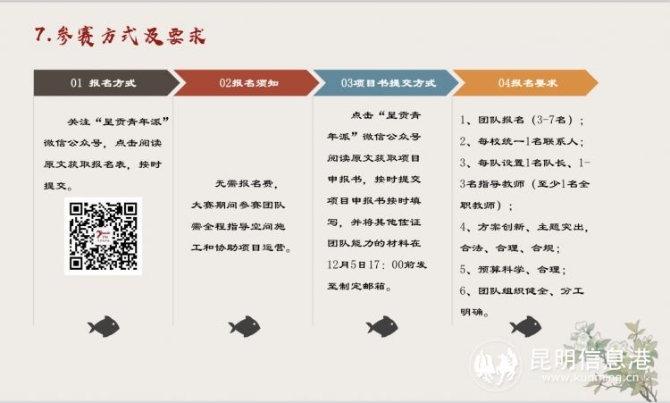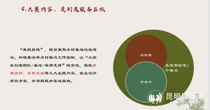 本届比赛由呈贡区创文社会志愿服务指挥部、呈贡区委统战部、共青团呈贡区委联合开展,分为大赛发布、赛前调研、项目征集、项目路演、签订合同、落地孵化、项目结项等流程,共设置了3个专项赛道,分别是“互联网+”媒介赋能宣传赛道、“刘家营”非遗赋能空间赛道、“万溪冲”乡史赋能设计赛道。普通高校本专科学生及在读研究生均可参赛,参赛团队需根据所提供的村庄概况、发展思路、业态类型及空间信息资料,选择其中一个社区具体题目作为团队参赛项目。
