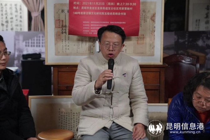 昆明信息港讯 记者李红鸾 11月25日晚上,由昆明市盘龙区文化和旅游局、盘龙区龙泉街道办事处指导,昆明市盘龙区龙泉古镇文化研究主办,盘龙区文物管理所、盘龙区图书馆、盘龙区文化馆支持的第一期院士之乡读书会在龙泉古镇文化研究院、老昆明杂书馆举办。