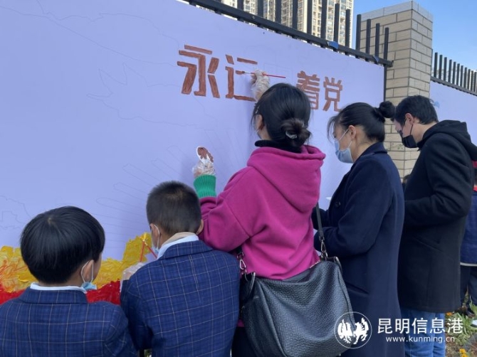 现场,来自云南中医药大学党史学习教育宣讲团成员王易晗老师为参加活动的全体人员带来了一场别样的“广场党课”。云南中医药大学师生、广电苑小学师生、幼儿园师生、家长、龙潭山社区大党委单位成员、社区党员、广大居民、双报到党员代表共同学习了党的十九届六中全会精神。随后,大家还一起绘制了百米“党建+中华优秀传统文化”主题彩绘墙。