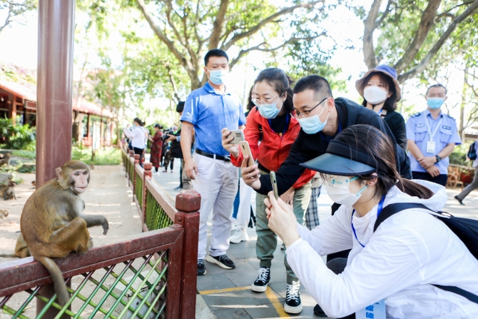 走进陵水南湾猴岛景区,仿佛置身于花果山,绿的世界、花的海洋。顽皮、可爱的猴儿们在绿荫下、树枝间扑腾纵跃、追逐打斗,倘若无人地嬉戏。在猕猴广场,来自全国各地的50家重点网络媒体的记者、编辑争相与小猴合影,喂小猴吃花生,与猕猴近距离接触。管理员喂食时,猕猴们有的连蹦带跳,有的在树上一连串腾跃秋千,一眨眼功夫便集合完毕,一边争吃,一边唧唧咕咕地打闹。