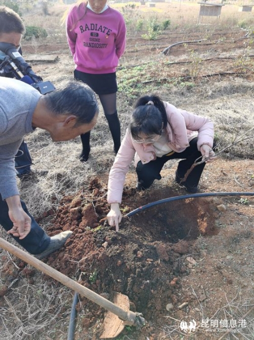 最后,专家们到鲁黑村,进一步了解农村基本情况,结合鲁黑村实际情况提供专业指导。村合作社3年前种植了55亩蓝莓迷宫,至今长势差、不挂果,村民都急坏了。昆明市农科院经作所副所长陈杉艳下到地里刨土挖苗,通过土壤和水质分析、病虫害判断、询问农药水肥情况等途径,与村民详细分析原因,并给出了改进治理方案。