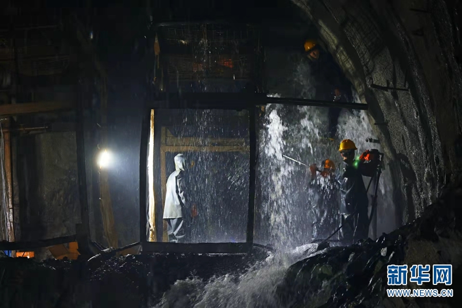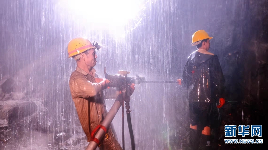 铁路建设者们在涌水的景寨隧道内艰难施工(资料图)。新华网发(徐章位/摄)